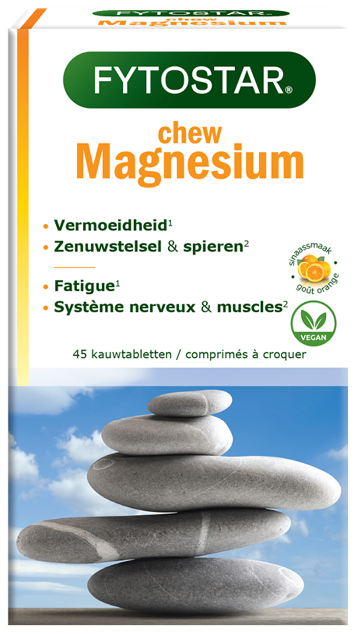 Fytostar Chew Magnesium est un comprimé à croquer ultra-dosé contenant du magnésium pour réduire la fatigue. Le magnésium contribue également au fonctionnement normal du système nerveux et des muscles. Les comprimés de magnésium ont un agréable goût fruité grâce à l'arôme d'orange et de citron.
