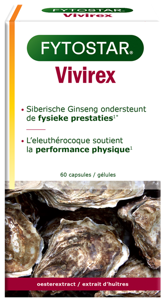 60 gélulesFytostar Vivirex est une formule conçues pécialement pour l’homme. Vivirex contient un extrait d’1eleuthérocoque, qui soutient la performance physique. La 2vitamine B12 contribue à réduire la fatigue. Le 3zinc contribue à maintenir un bon taux de testostérone dans le sang et le 4sélénium à maintenir une production saine des spermatozoïdes. En outre, Vivirex contient de l’extrait d’huître pur associé à des extraits de livèche et de feuilles de damiana.