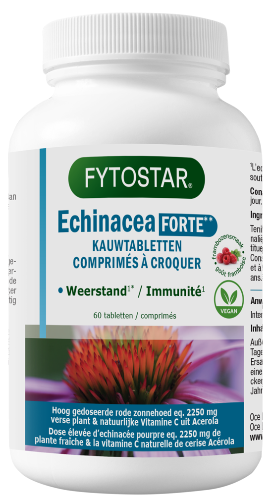 60 kauwtablettenFytostar Echinacea Kauwtabletten met frambozensmaak bevatten een hoge dosering van echinacea en natuurlijke vitamine C uit de Acerola-kers. Echinacea en natuurlijke vitamine C ondersteunen het immuunsysteem. Fytostar Echinacea Forte bevat 1,8 keer meer verse Echinacea dan een gemiddeld Echinacea product. Geschikt voor vegetariërs & veganisten.