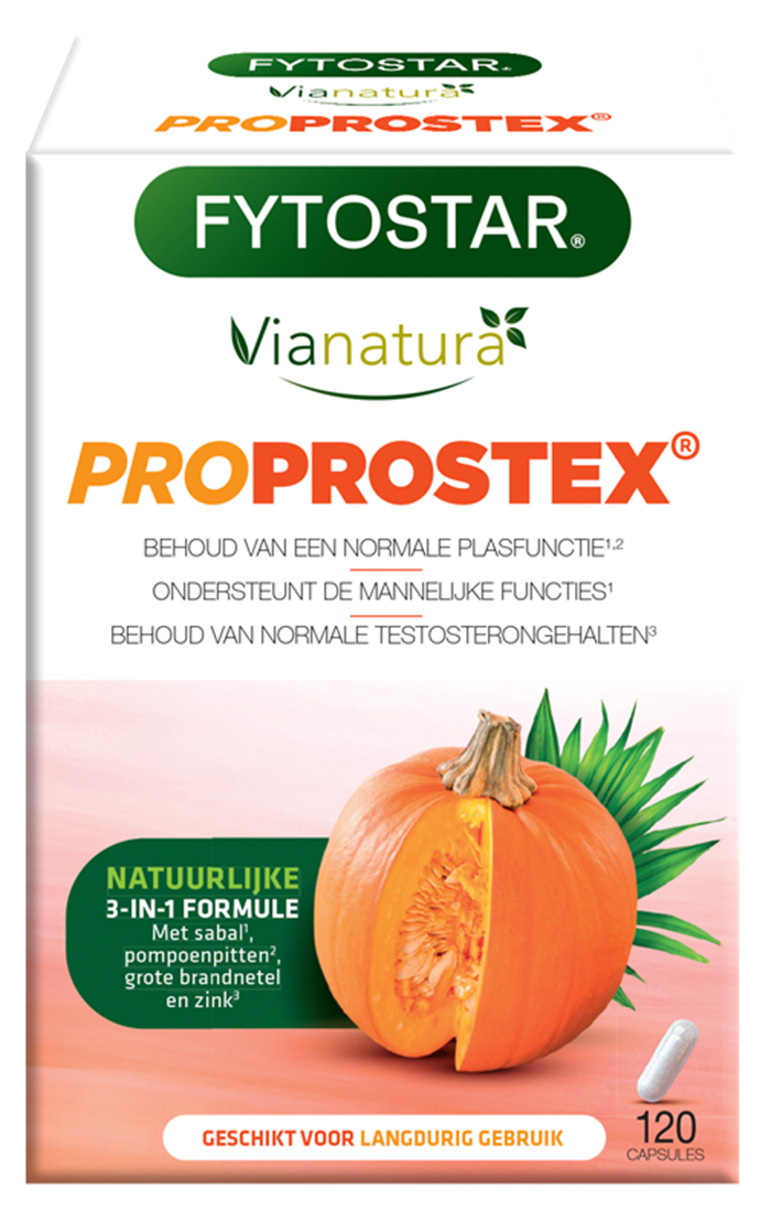 Fytostar Vianatura Proprostex® is een uitgebreide formule met bestanddelen specifiek voor de mannelijke functies. 1Sabal zorgt voor het behoud van een normale plasfunctie*. Daarnaast ondersteunt 1Sabal de mannelijke functies*. 2Zink draagt bij tot de instandhouding van een normaal testosterongehalte in het bloed.